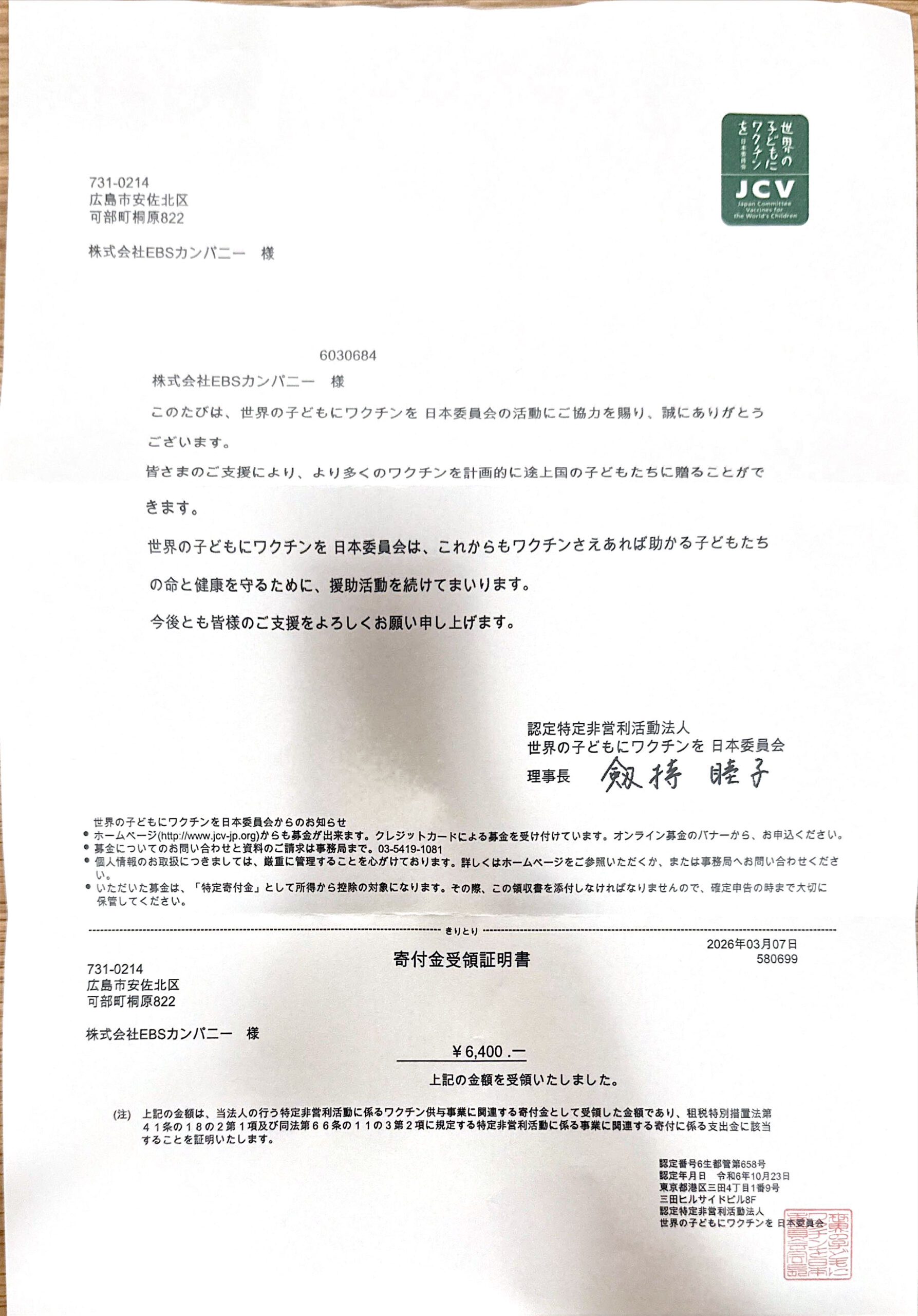2026年3月は認定NPO法人 世界の子どもにワクチンを 日本委員会(JCV)さまへ、6400円をご寄付させていただきました。1本20円のワクチンに換算して、**320人分**のワクチンを届けることができました。
